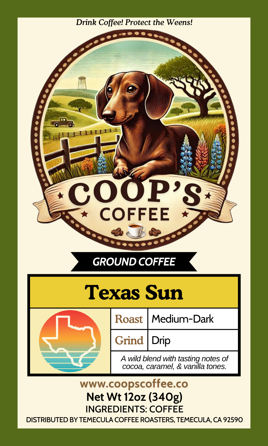 Bold, smooth, and unapologetically Texan. Our Texas Sun blend captures the warmth and spirit of the Hill Country with every sip. This medium-dark roast features rich tasting notes of cocoa, caramel, and vanilla, delivering a perfectly balanced cup that shines from sunrise to sunset.